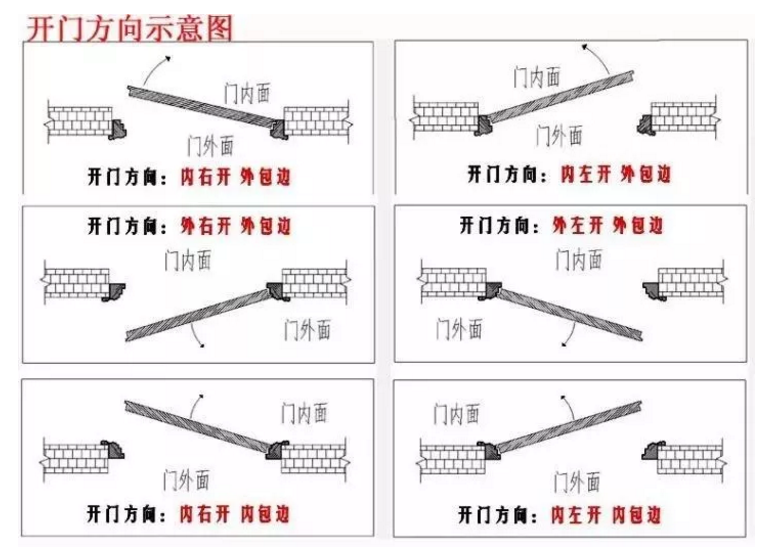 我們知道,開門的方向可以分為:內(nèi)左、內(nèi)右、外左、外右四個方向,這四個方向各不相同,其實在選擇開門方向的時候,首先是根據(jù)個人的習(xí)慣和家人的習(xí)慣來選擇門開啟的方向的,使用順手才是最關(guān)鍵的。